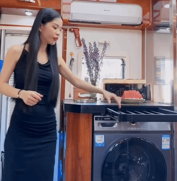 Thiết kế của chiếc xe chính là điều khiến dân tình tò mò nhất. Hằng Du Mục cũng không ít lần giới thiệu công năng của từng khu vực trên xe: Có thể chứa được 7 người gồm tài xế và 6 người ngồi đằng sau, có bàn ăn, tủ lạnh, phòng bếp, máy giặt, nhà tắm và vệ sinh, giường ngủ.