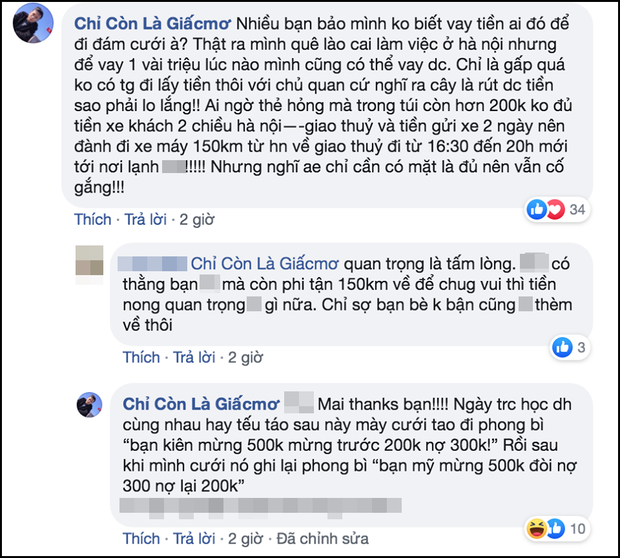 "Nhiều bạn bảo mình không biết vay tiền ai đó để đi đám cưới à? Thật ra mình quê Lào Cai làm việc ở Hà Nội, để vay 1 vài triệu lúc nào mình cũng có thể vay được. Chỉ là gấp quá không có thời gian đi lấy tiền thôi với chủ quan cứ nghĩ ra cây là rút được tiền sao phải lo lắng! Ai ngờ thẻ hỏng mà trong túi còn hơn 200k không đủ tiền xe khách 2 chiều Hà Nội - Giao Thuỷ (Nam Định) và tiền gửi xe 2 ngày nên đành đi xe máy 150km về. Nhưng nghĩ anh em chỉ cần có mặt là đủ nên vẫn cố gắng!".