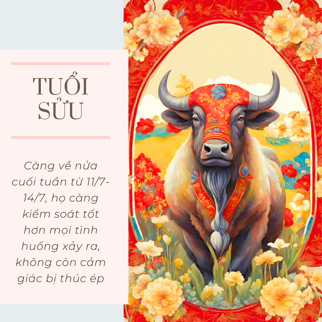 Công việc của người tuổi Sửu trong tuần này ổn định hơn so với tuần trước nhờ vào việc họ đã ý thức rõ hơn về việc cân đối thời gian, biết ưu tiên những việc quan trọng và để lại những việc có thể giải quyết sau. Do đó, càng về nửa cuối tuần từ 11/7-14/7, họ càng kiểm soát tốt hơn mọi tình huống xảy ra, không còn cảm giác bị thúc ép.