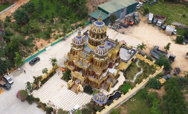 Tòa lâu đài đồ sộ của gia đình anh Thoan lấy tông màu chủ đạo là vàng đồng, tím xanh, cao gần 40m, diện tích khoảng 400m2 (trên tổng diện tích 720m2) khởi công từ tháng 2/2022. Lâu đài có 3 tầng chính, 3 tầng tum, tum cao nhất 18m, tổng chiều cao gần 40m.