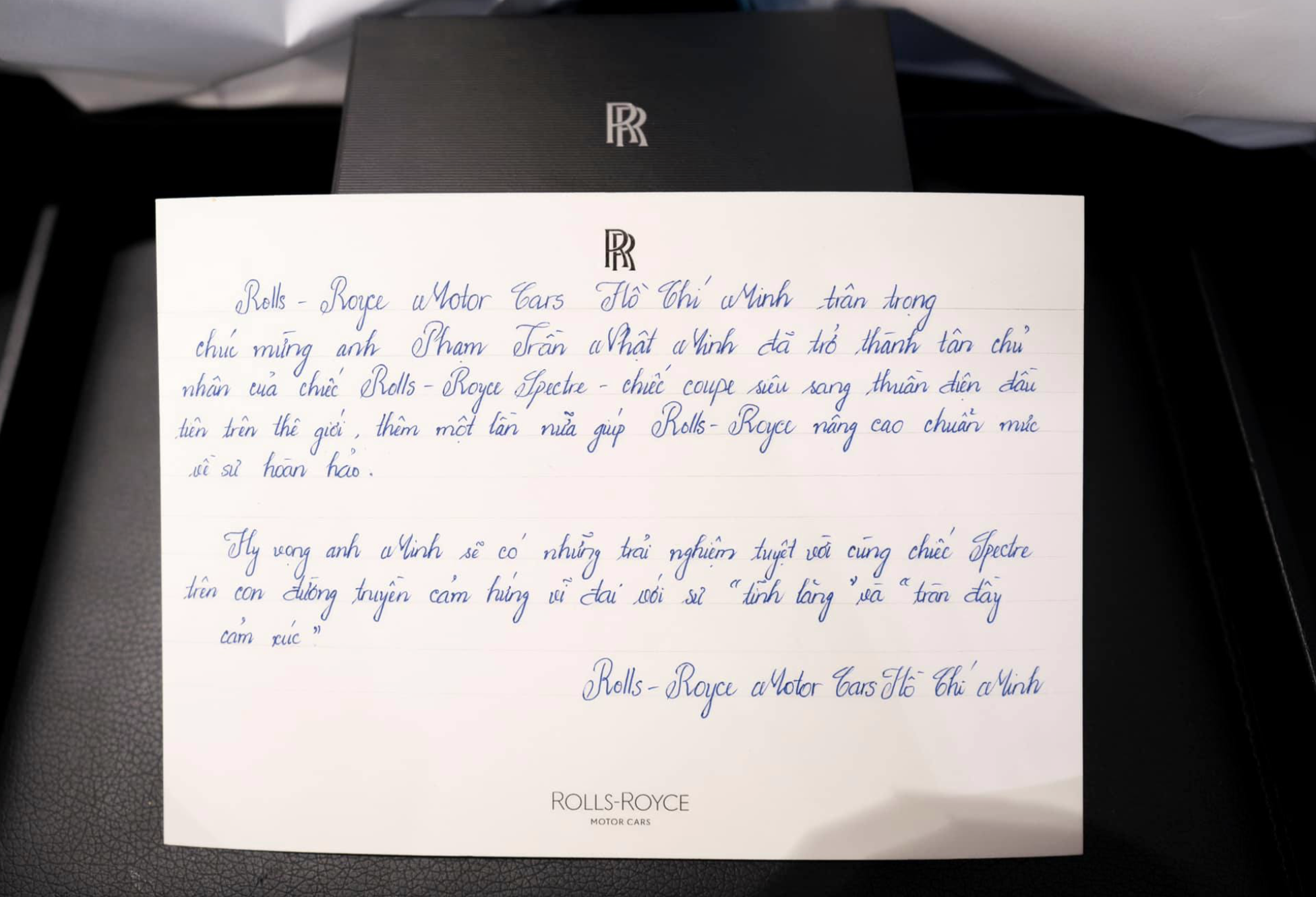 Được biết, hiếc xe mà Minh Nhựa sở hữu không chỉ là chiếc Spectre đầu tiên xuất hiện tại Việt Nam mà còn đặc biệt bởi sự chú trọng đến từng chi tiết cá nhân hóa. Ngoại thất của xe được sơn màu trắng tinh khôi với đường coachline nổi bật màu xanh dọc thân xe. Nội thất xe cũng không kém phần sang trọng với hai tông màu trắng và xanh dương cho da bọc ghế, điểm tô bởi dây đai an toàn màu kem. Sự tinh tế còn thể hiện qua màu sắc đồng điệu trên tapi cửa và bệ tì tay trung tâm...
