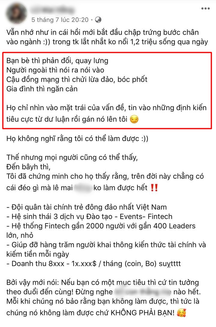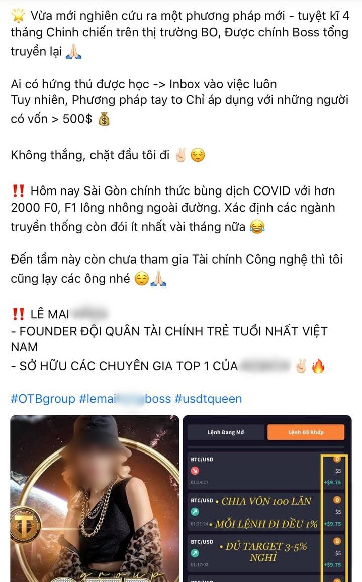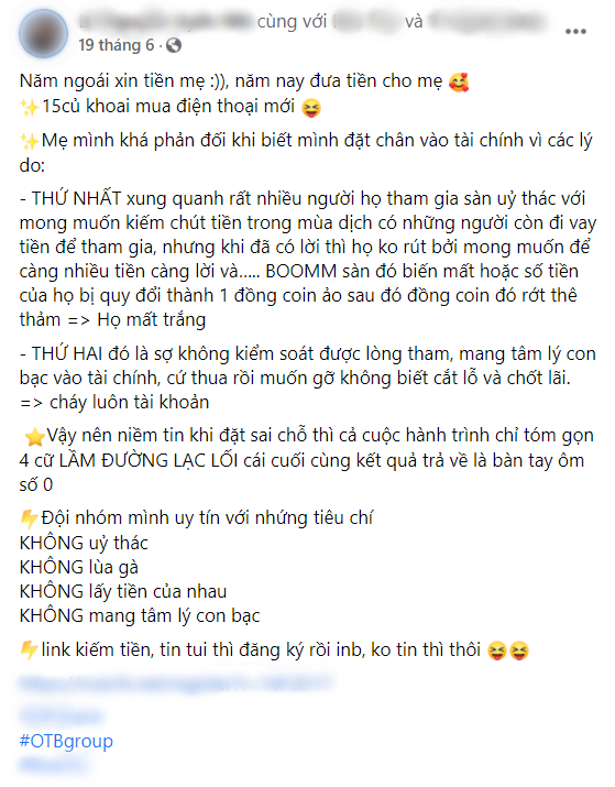 Trang cá nhân của chị em H. thu hút hàng chục nghìn lượt follow với tương tác khá khủng. Trong khi cô chị tự nhận mình là chuyên gia giàu kinh nghiệm, biết nhiều kiến thức chơi tiền ảo, giao dịch tài chính 4.0 và cam kết "không lừa đảo", thì cô em chính là trợ thủ đắc lực trong việc lôi kéo thêm hội viên tham gia OTB.