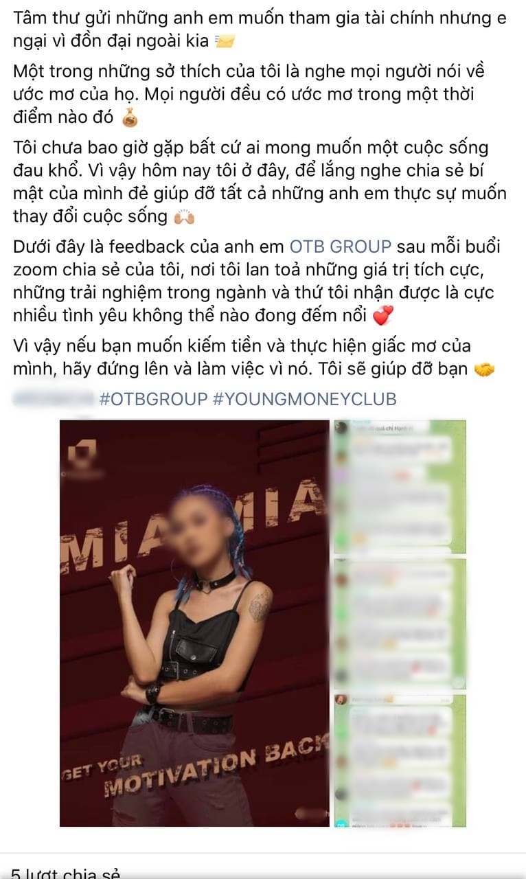 Cô chị H1 luôn khẳng định công việc tài chính của mình không lừa đảo, có lợi nhuận vô cùng hấp dẫn, đảm bảo hướng dẫn thành viên tham gia không mất tiền, đầu tư vốn vào sẽ sinh lời gấp nhiều lần. Bản thân cô "khoe" rằng mình chỉ cần có 6 tháng để trở thành thủ lĩnh của OTB.