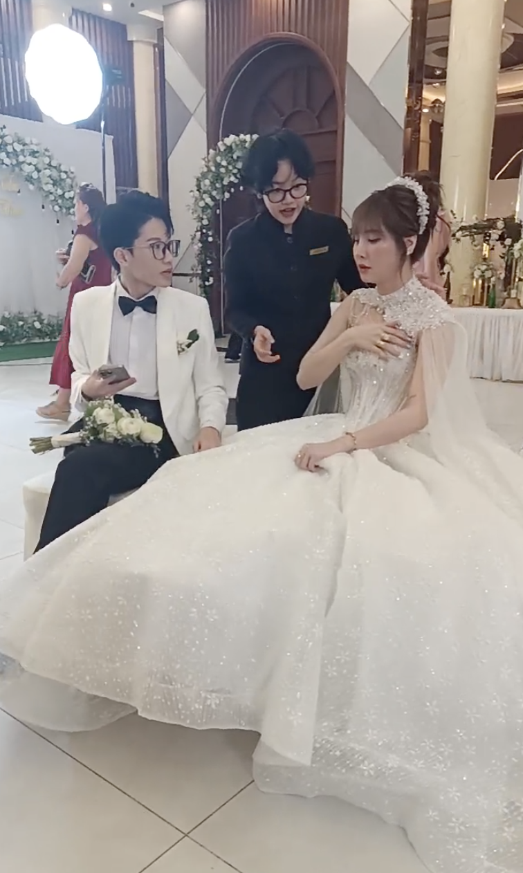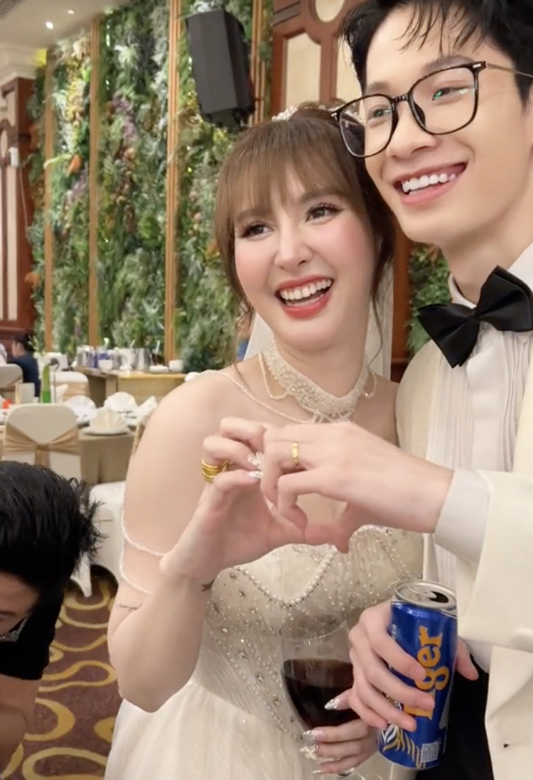 Theo đó, trong lễ vu quy, cặp đôi diện trang phục truyền thống là áo dài đỏ. Visual cô dâu chú rể nhận nhiều lời khen vì sắc vóc tương xứng, cực đẹp đôi. Khi tổ chức hôn lễ, Ngân Sát Thủ xuất hiện xinh đẹp, rạng rỡ với chiếc váy cưới lộng lẫy như công chúa. Còn tuyển thủ Văn Đông cũng không lép vế so với vợ, chàng trai sinh năm 2k3 nhận nhiều lời khen khi mặc vest bảnh bao, ra dáng chú rể.