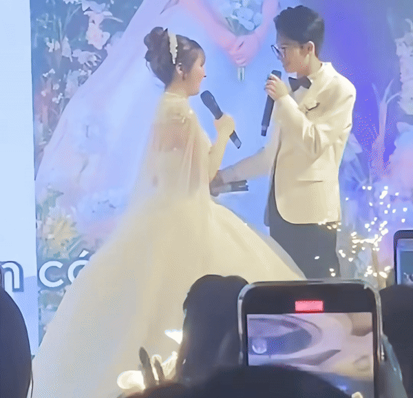 Trong tiệc cưới, khoảnh khắc cô dâu chú rể xuất hiện khiến nhiều người bất ngờ, xúc động. Bởi thay vì dắt tay nhau lên lễ đường, Ngân Sát Thủ và chồng hát song ca một ca khúc tình yêu ngọt ngào. Được biết, cặp đôi cũng đã dành nhiều thời gian để chuẩn bị tiết mục đặc biệt này trước lễ cưới, dành tặng cho các khách mời tham dự.