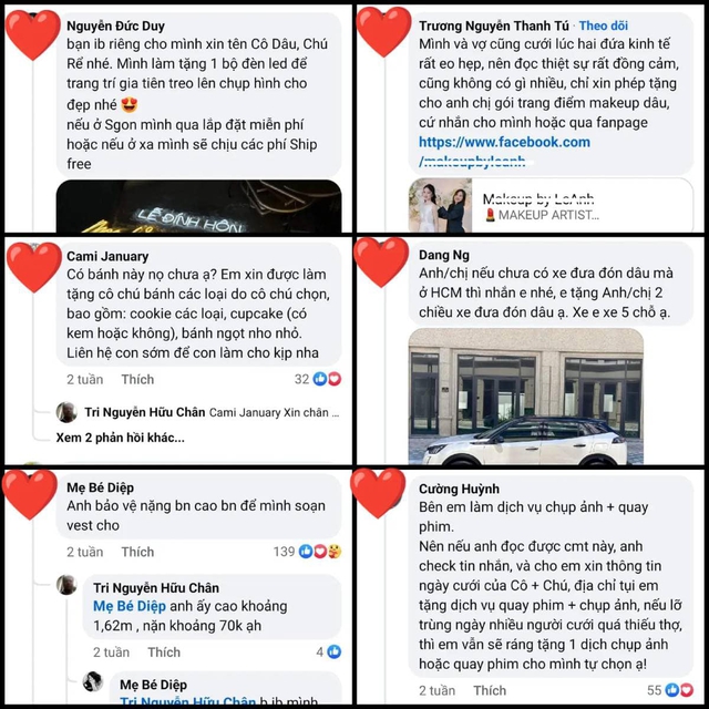 Cụ thể, người muốn tặng lại bộ áo dài, người cho đôi giày, thậm chí họ còn đề nghị giúp đỡ mâm cỗ, chụp ảnh, xe ô tô di chuyển cho cô dâu và chú rể.