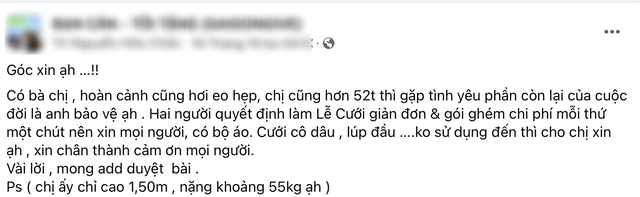 Hai người quyết định làm lễ cưới giản đơn, gói ghém chi phí mỗi thứ một chút. Mọi người có bộ áo, cưới cô dâu, lúp đầu … không sử dụng đến thì cho chị xin. Chân thành cảm ơn”. Bài đăng kèm số cân nặng và chiều cao cô dâu, ngay lập tức có hàng trăm bình luận bên dưới bài đăng ngỏ ý muốn giúp đỡ.