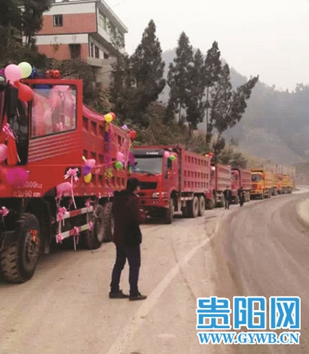 Vào ngày 1/1 vừa qua, tại thành phố Tuân Nghĩa, tỉnh Quý châu (Trung Quốc) đã diễn ra một đám cưới có một không hai khi chú rể sử dụng 12 chiếc xe tải công trình đi đón dâu.