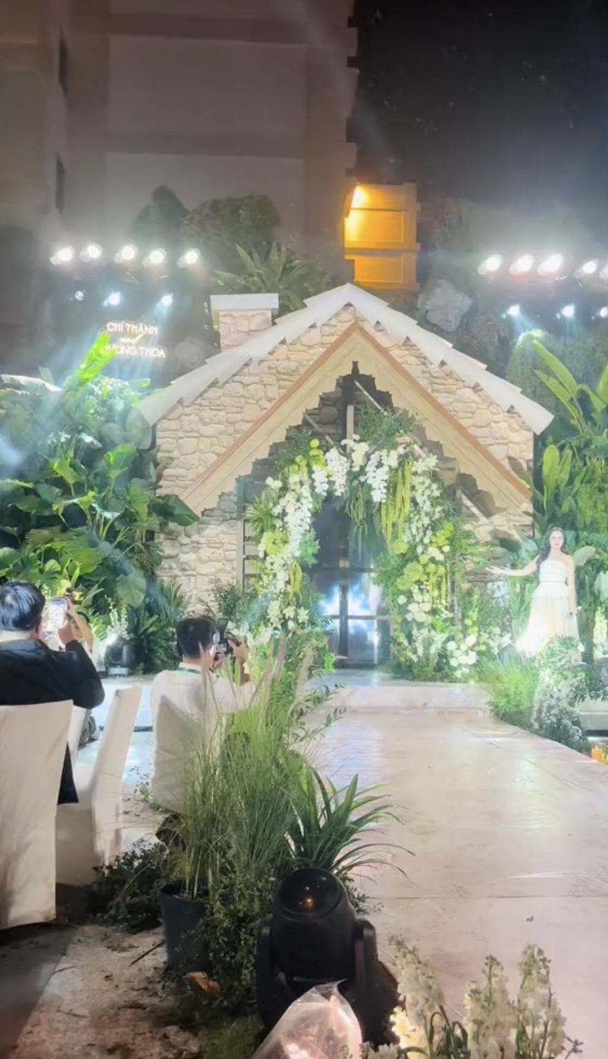 Không gian tiệc cưới được Việt Phương Thoa và Chí Thành chọn tone màu xanh và trắng làm chủ đạo. Có rất nhiều cây xanh, hoa tươi được bày biện khắp nơi, y hệt như một khu rừng nhiệt đới. Đặc biệt, trên sân khấu còn có cả mô hình ngôi nhà hạnh phúc, đây cũng là chi tiết được hé lộ trong chiếc thiệp cưới độc đáo của cặp đôi.