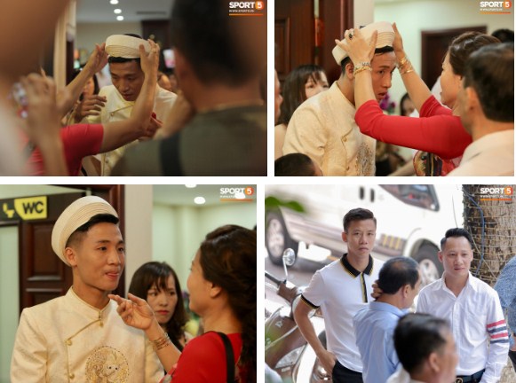 9h20: Nhà trai lên đường sang nhà gái tổ chức lễ chính. Các đồng đội của Bùi Tiến Dũng tại CLB Viettel là Quế Ngọc Hải, Trọng Hoàng hay Vũ Minh Tuấn đều đã có mặt.