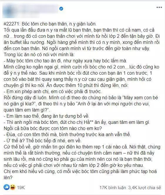 Thế nhưng, chàng trai trong câu chuyện sau đây đã có một nước đi "thẳng vào lòng đất". Cụ thể, trong buổi hẹn hò ra mắt người yêu với nhóm bạn thân, anh chàng đã "hồn nhiên" lột tôm cho cô bạn thân từ hồi cấp 2. Không dừng lại ở đó, thanh niên này còn trần tình với người yêu rằng "trước đây anh vẫn làm thế".