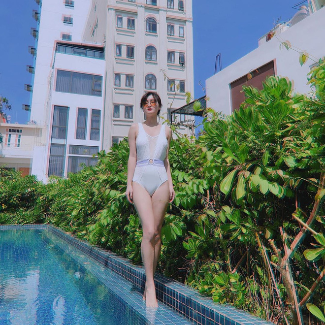 Nàng WAG Thuỳ Dương, bạn gái cầu thủ Huy Hùng diện những bộ bikini 1 mảnh trắng tinh để làm tôn lên làn da không chút tì vết của mình.
