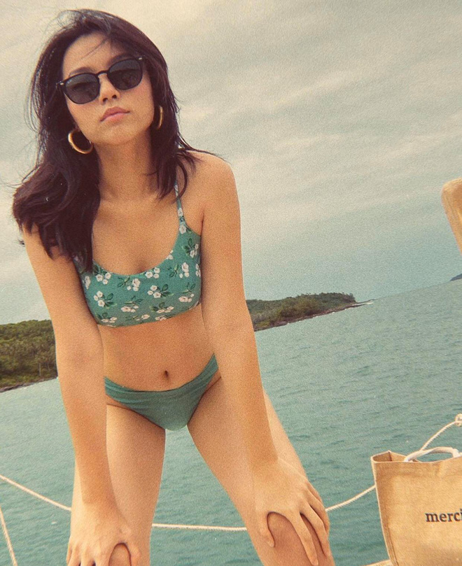 Travel blogger Lê Hà Trúc (24 tuổi) diện bikini hoa nhí xanh mint nhưng pose dáng lại cực ngầu. Nghe đâu 3 vòng của nàng cũng chính là 3 điểm mà chàng cơ trưởng thích nhất đấy.