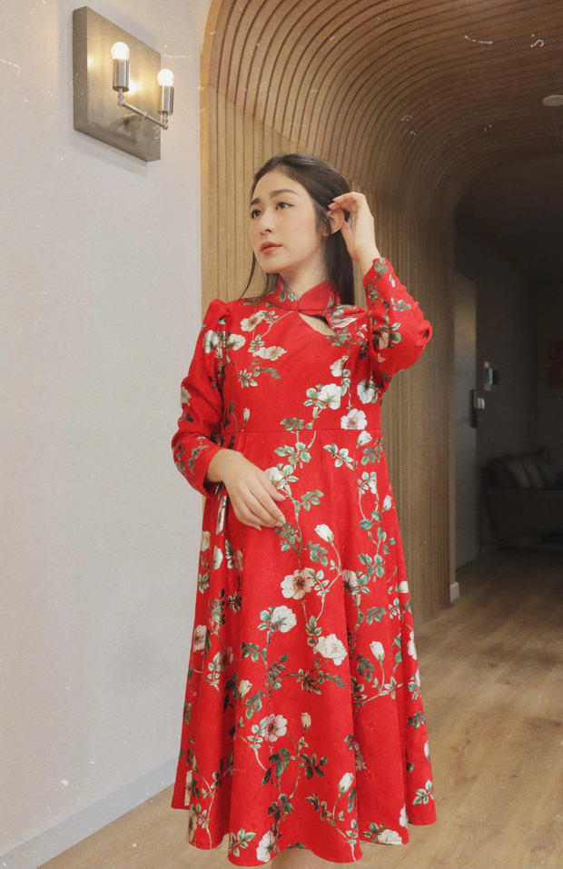 Bầu bí không làm Trang Lou chịu thua kém trên đường đua diện áo dài Tết. Mẫu áo dài cách tân đỏ rực vừa giúp cô nàng che bụng bầu vừa tôn thêm nhan sắc