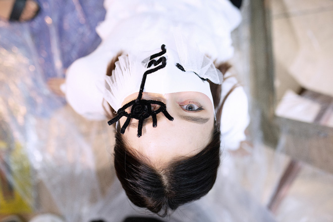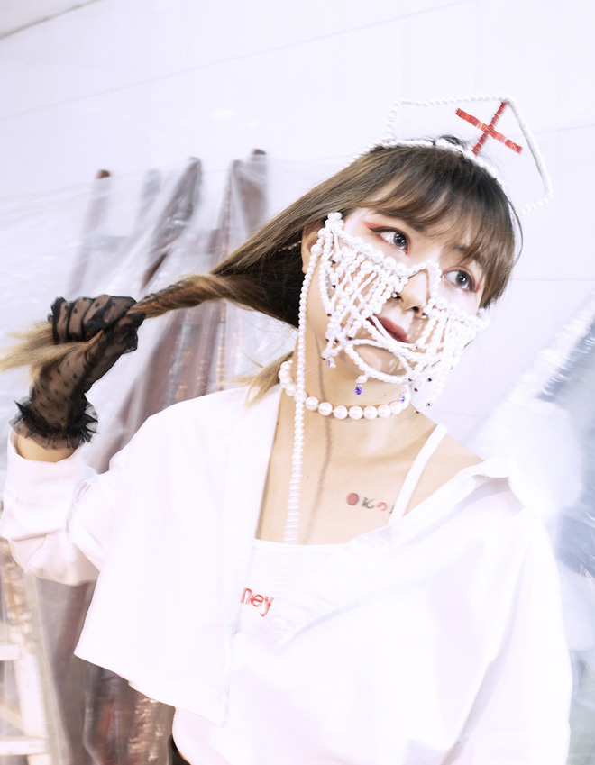 Cô bạn chia sẻ quá trình thực hiện mất 2 tuần từ lên ý tưởng, thiết kế, gia công cho đến chụp sản phẩm. Vì trong mùa dịch nên đồ hoàn toàn được tái chế 100%, nếu nguyên liệu nào quá khó kiếm mới phải order trên mạng. Đây cũng là bước khó nhất vì vừa phải sửa lại đồ, vừa kiếm nguyên liệu sao cho phù hợp với ý tưởng.