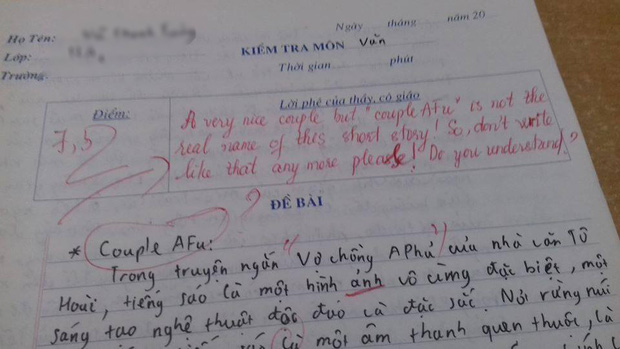 Những tưởng anh chàng này sẽ nhận được lời phê rất nghiêm khắc của giáo viên vì dám nghịch ngợm ngay cả trong bài kiểm tra nhưng phản ứng của cô giáo lại vô cùng thú vị. Vì học trò đã dùng tiếng Anh trong bài kiểm tra nên cô giáo cũng không ngần ngại đáp lại bằng một tràng nhận xét: "A very nice couple but "couple Afu" is not the real name of this short story! So, don't write like that any more please! Do you understand?" (Tạm dịch: Đúng là một cặp đôi rất đẹp nhưng "couple Afu" không phải là tên thật của truyện ngắn này! Vì vậy, đừng viết như thế nữa! Em hiểu chưa?").