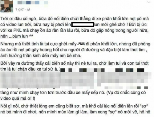 Facebook Nguyễn Anh chia sẻ: “Mình không phải phân biệt kì thị, nhưng mà mấy anh chàng chạy xe phân khối lớn một mình hay theo đoàn tự cho mình cái quyền sử dụng đèn ưu tiên, chạy bất chấp, dùng tiếng pô xe thay cho đèn xin đường, thay cho luật lệ giao thông là không thể chấp nhận được”.
