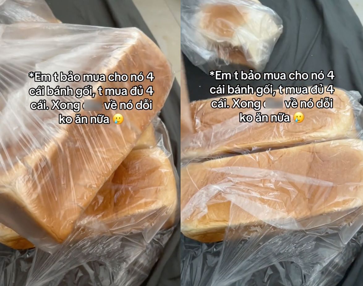 Nhìn hình ảnh này, hẳn ai cũng đã hiểu ngay được đầu đuôi câu chuyện. Bởi chủ nhân bài đăng đã mua về 4 chiếc bánh mì gối chứ không phải 4 chiếc bánh gối như người em yêu cầu. Loại bánh gối mà người em nhắc đến lại là một loại bánh khác.