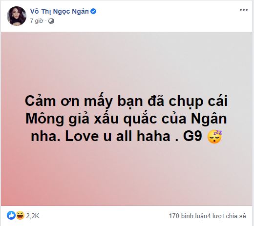 Đáng nói, sau khi loạt khoảnh khắc khó coi này bị lan truyền khắp nơi, Ngân 98 đã đăng tải ngay một dòng status thể hiện sự bất cần: "Cảm ơn mấy bạn đã chụp cái mông giả xấu quắc của Ngân nha. Love you all haha".
