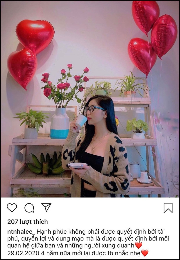Riêng Nhật Lê, sau vụ drama tái hợp với Quang Hải, cô nàng lại thả nhẹ một chiếc định nghĩa về hạnh phúc trên trang cá nhân. Đương nhiên đây cũng chỉ là một dòng quote copy trên mạng như mọi status deep khác của Nhật Lê thôi. Nhưng với emo trái tim đỏ chót phấp phới như này, có vẻ như cô nàng lại đang đắm chìm trong hạnh phúc rồi đây.