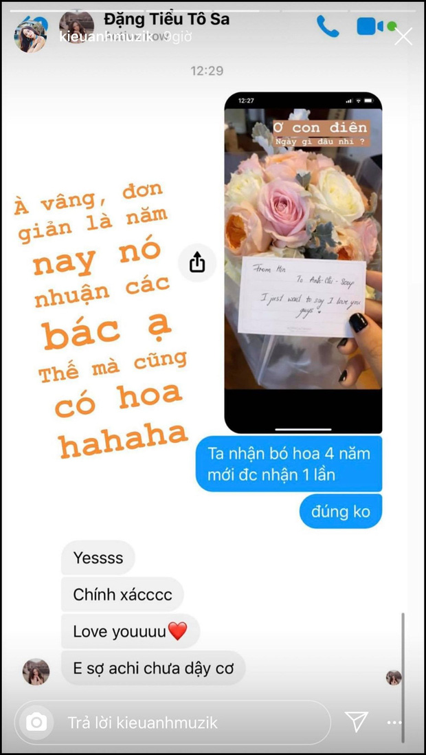 Rich kid Đặng Tiểu Tô Sa mua hoa tặng chị dâu ca nương Kiều Anh nhân ngày... 29/2 kèm những lời cực tình cảm.