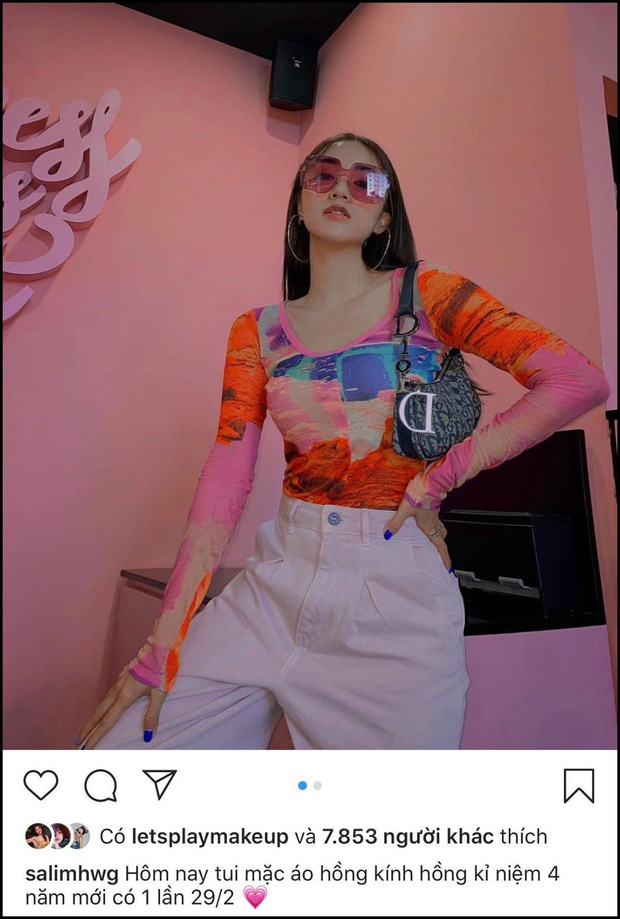 Để kỉ niệm ngày mà 4 năm mới có 1 lần, Salim chơi trội với áo hồng, kính hồng trên background cũng màu hồng nốt.
