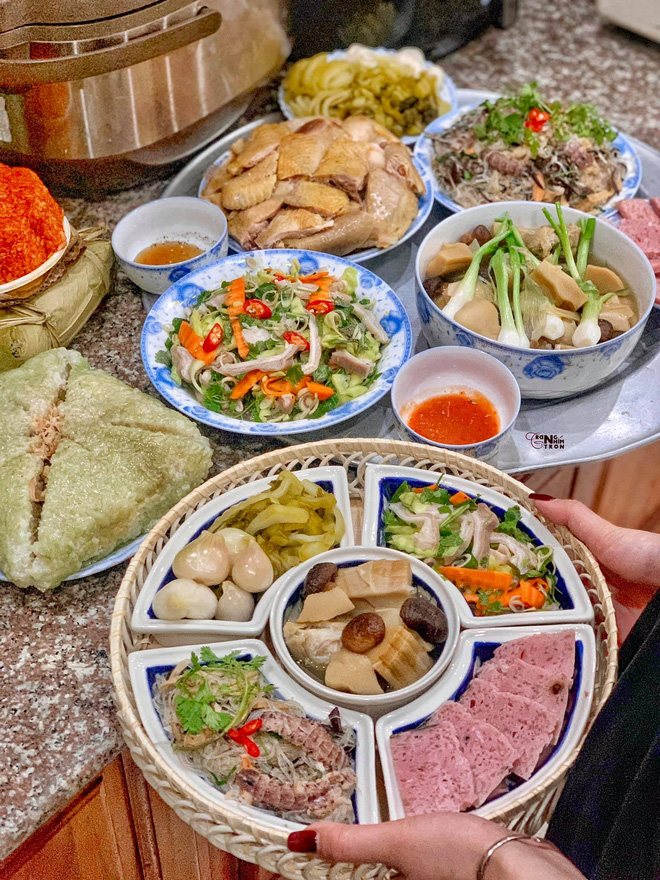 Một mâm cơm tất niên với đầy đủ các món truyền thống, lại có cả bánh chưng và bánh tét nhé!