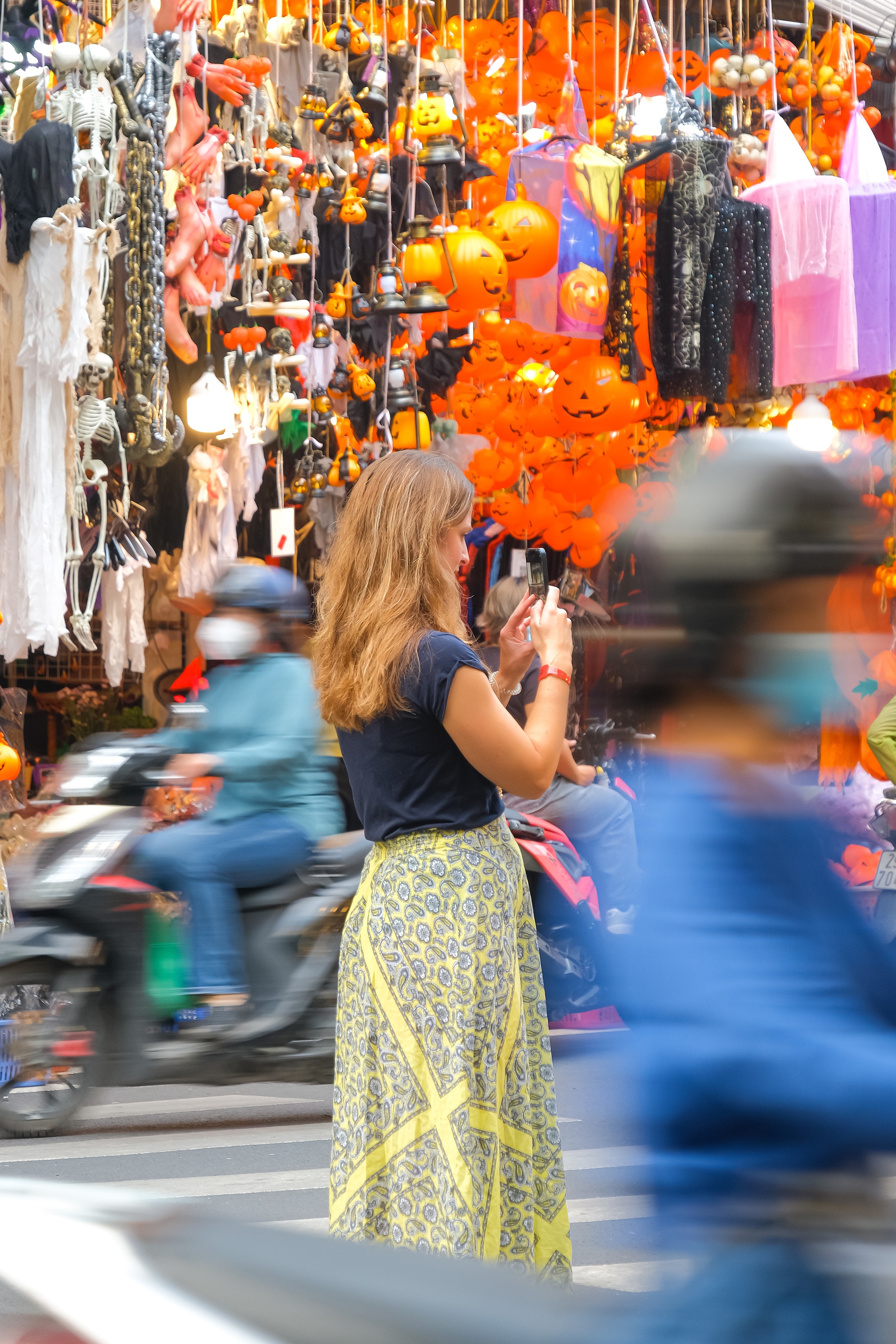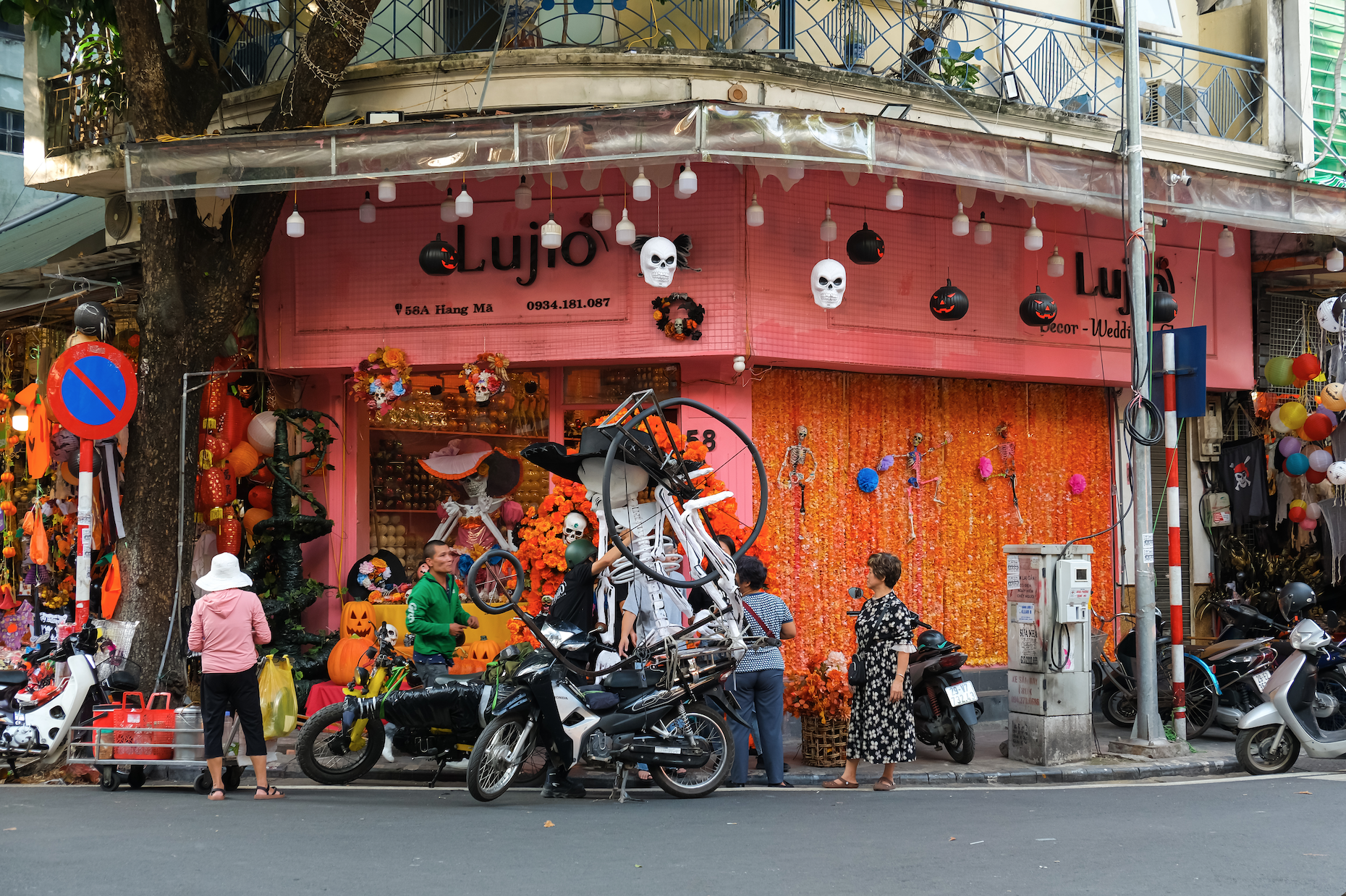 Mặc dù không còn mô hình bộ xương đạp xe nữa nhưng trên con phố Hàng Mã hiện tại vẫn ngập tràn không khí và màu sắc Halloween với nhiều món đồ trang trí khác như những bộ xương, những quả bí ngô...
