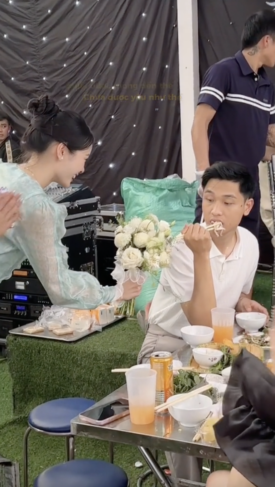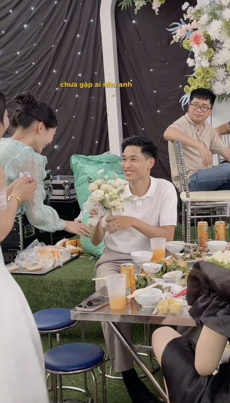 Theo đó, chàng trai đang hồn nhiên ăn tiệc thì cô gái cầm bó hoa cưới vừa bắt được, chạy đến tặng cho người yêu. Đáng nói là trước hành động bất ngờ này, anh chàng không kịp “nhảy số”, gương mặt ngỡ ngàng và trên đũa vẫn còn miếng mực chưa kịp ăn xong. Sau vài giây định thần, anh mới bắt đầu cười toe toét vì vui.