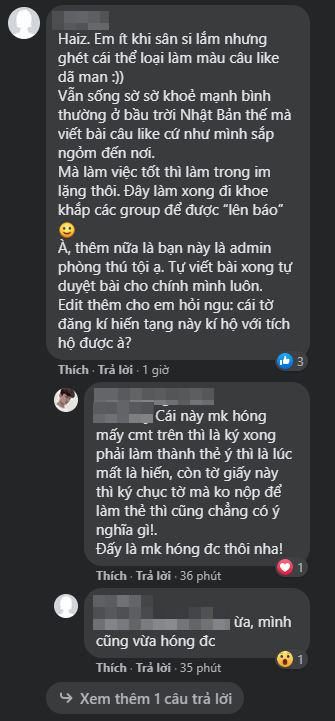Sau khi hình ảnh được đưa lên, rất nhiều bình luận đã "ném đá" cô gái, cho rằng cô đang kiếm "fame ảo". Thậm chí, một số người, vì quá phẫn nộ đã buông những lời lẽ khá nặng nề. Bên cạnh đó, cũng có thông tin cô bạn này hiện đang ở Nhật Bản, hoàn toàn khỏe mạnh. Giấy hiến tạng chỉ là trên mạng tải về. Ngoài ra, cô cũng chẳng phải người đặt bút ký mà chỉ là nhờ người thân ở Việt Nam ký giúp.