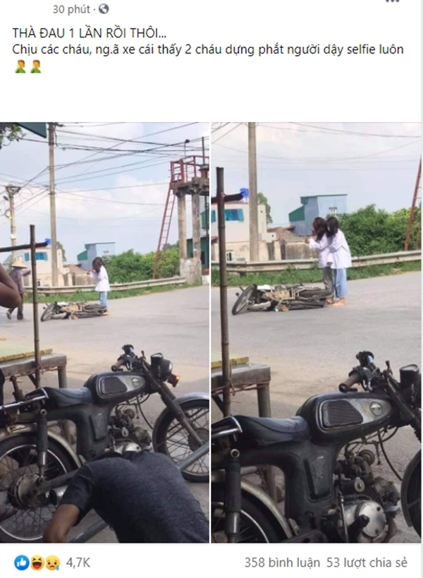 Mới đây trên một diễn đàn đã đăng tải hình ảnh cùng sự việc về hai cô gái trẻ bị ngã xe máy khi đang đi trên đường. Theo như bài đăng này chia sẻ thì hai cô gái sau khi bị ngã đã lập tức đứng dậy, rút điện thoại ra và... chụp hình.