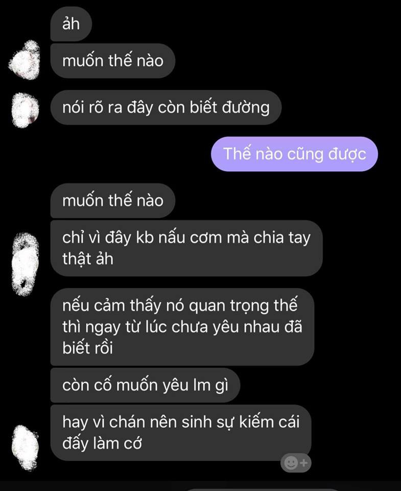 Cô gái Hoàn Hoàn cũng nhảy vào dòng bình luận: "Chẳng cần biết đúng sai, nhưng chưa gì đã thấy không tôn trọng nhau rồi, có mỗi việc bạn gái không biết nấu ăn cũng đăng đàn bới móc. Chưa kể suy nghĩ rõ cổ hủ, sống ở thời nào rồi mà còn nghĩ đàn bà là chủ gian bếp, phải giỏi giang nấu nướng. Thôi đi, không thích thì chia tay đừng nhiều lời".