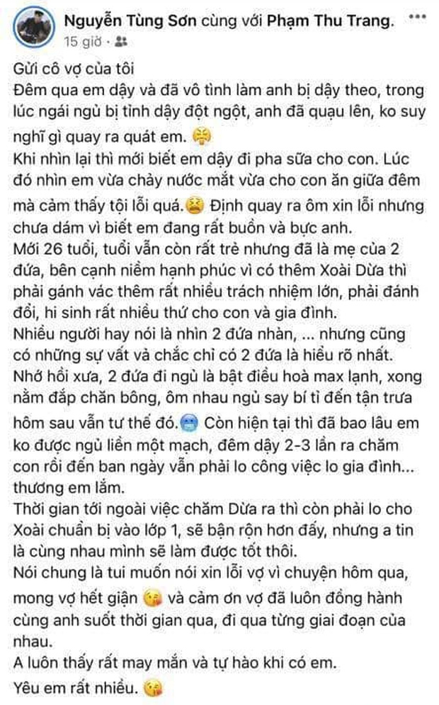 Theo chia sẻ, vì Trang Lou dậy giữa đêm, vô tình làm mình dậy theo nên anh chồng hot boy này đã quạu lên và quát vợ. Thế nhưng đến khi nhìn lại thấy vợ đi pha sữa cho con rồi vừa cho con ăn vừa khóc thì Tùng Sơn mới cảm thấy có lỗi: "Định quay ra ôm xin lỗi nhưng chưa dám vì biết em đang rất buồn và bực anh".