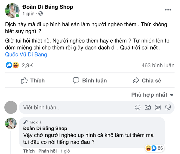 Ở phần bình luận, Đoàn Di Băng còn nửa đùa nửa thật: "Vậy chớ người nghèo up hình cá khô làm tui thèm mà tui đâu có nói tiếng nào đâu?".
