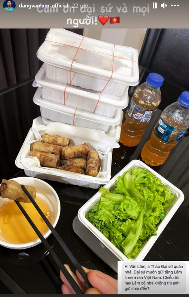 Trên trang cá nhân, Đặng Văn Lâm chia sẻ lời cảm ơn tới những người bạn Việt Nam tại Thái Lan và ngại Đại sứ đã gửi tặng mình những hộp nem rán, món ăn đậm chất Việt Nam nhưng đã lâu rồi Văn Lâm chưa được thưởng thức. Thủ thành sinh năm 1993 này luôn vô cùng yêu thích các món ăn Việt Nam. Anh từng chia sẻ sau mỗi dịp Tết Nguyên đán đều tăng vài cân vì không thể "kìm lòng" trước các món ăn như bánh chưng, giò chả hay nem rán.