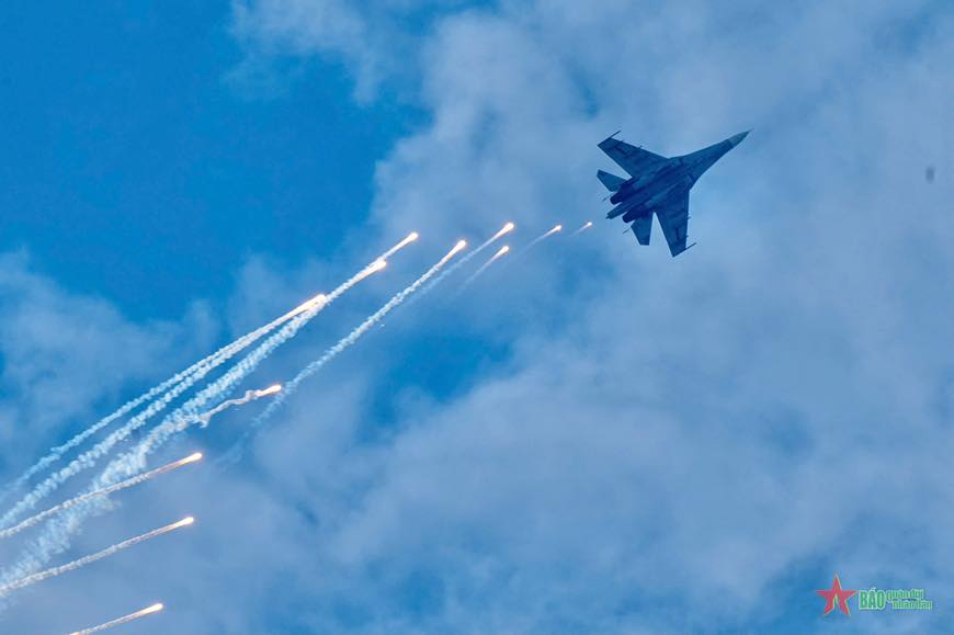 | Phần trình diễn bay mở màn khai mạc triển lãm của tập thể phi công phản lực đến từ 3 trung đoàn không quân tiêm kích E935, E927, E923 trên máy bay Su 30MK2.(Nguồn: @vietnampeopleairforce). |