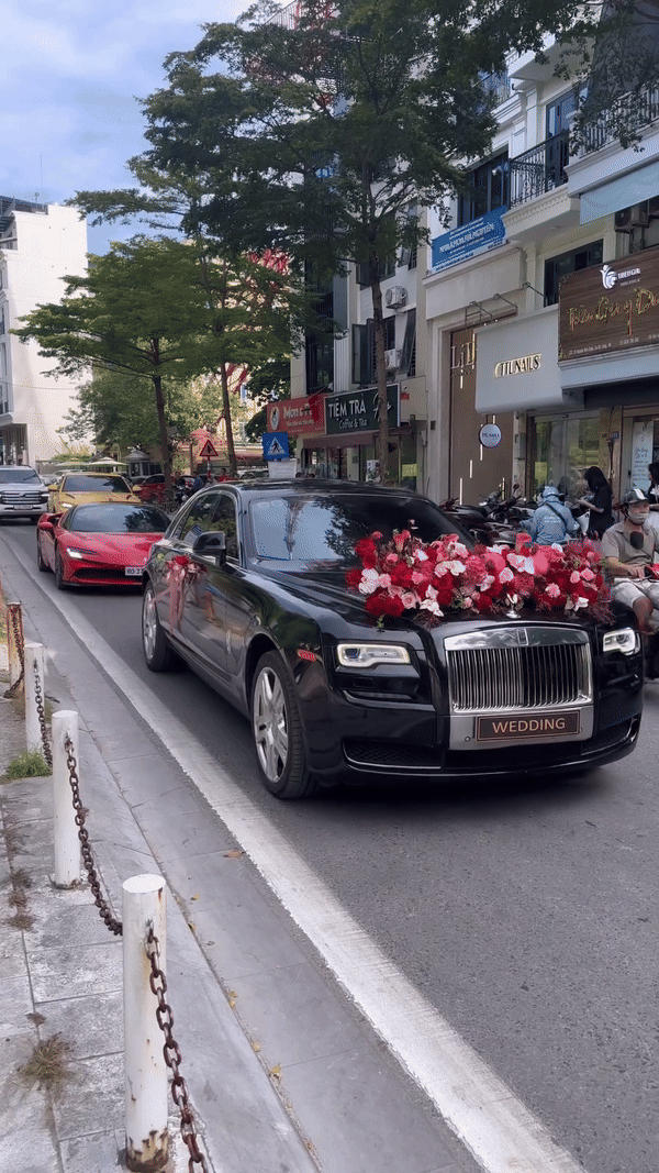 Cụ thể, Nam Vũ dẫn đầu đoàn xe với một chiếc Rolls-Royce Ghost làm xe hoa, được cho là xe riêng của gia đình chú rể. Theo sau đó, những chiếc xe của gia đình, người thân và bạn bè cặp đôi cũng đến từ các thương hiệu đắt đỏ như Rolls-Royce Phantom, Ferrari, Porsche, Lexus, Range Rover, Bentley,...