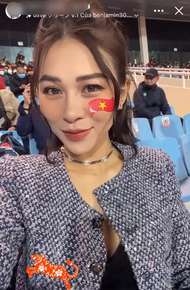"Ông xã mình là fan bóng đá nên đã săn vé xem trận Việt Nam và rủ mình đi cùng để xem. Lúc đó đi xem cũng không nghĩ được quay đến và lên Tivi hay gì. Cuối cùng phát hiện ra mình xuất hiện trên sóng truyền hình, cả hai vợ chồng đều bất ngờ vô cùng", Trà My chia sẻ.