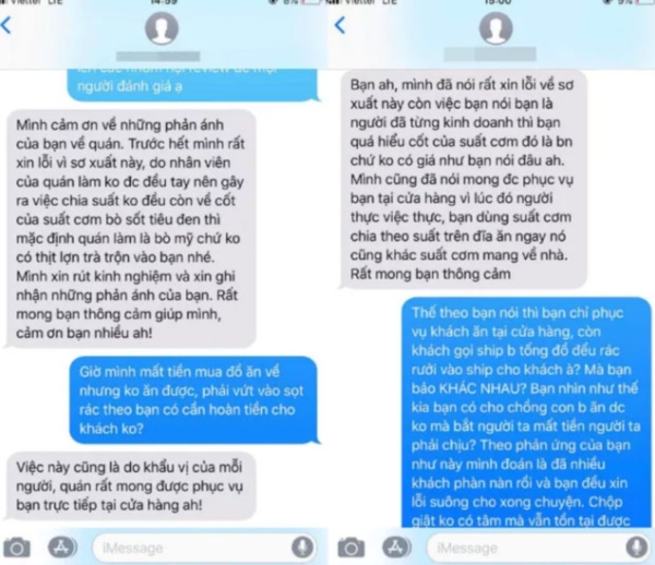 Bạn ấy cũng kinh doanh đồ ăn nên chắc hiểu rõ phần cơm này vốn bỏ ra là bao nhiêu, nên mình không giải thích thêm. Bên mình đã nhận lỗi, mời bạn ấy đến quán dùng bữa vì suất cơm chia trên dĩa sẽ khác cơm mang về nhà.