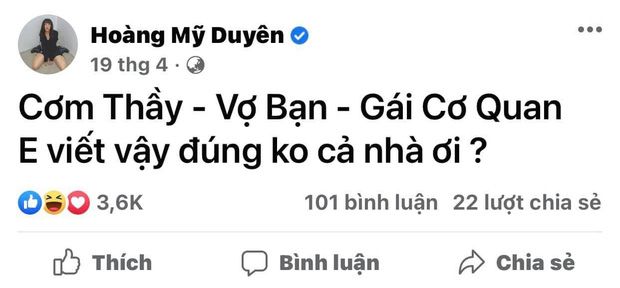Trước đó, hôm 19/4, Du Uyên cũng đã đăng status đầy ẩn ý "Cơm thầy - vợ bạn - gái cơ quan. Em viết vậy đúng không cả nhà ơi?". Và đến ngày 25/4 cô nàng xác nhận đã chia tay Đạt G. Tuy nhiên hiện tại status này đã không còn trên trang cá nhân của Du Uyên nữa.