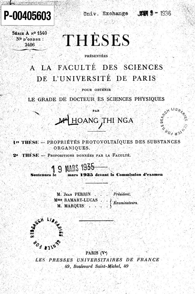 Ngày 19/3/1935, bà bảo vệ thành công luận án Tiến sĩ Khoa học vật lý (Docteur ès sciences physiques) với nhan đề "Tính chất quang điện của các chất hữu cơ" (Propriétés photovoltaïques des substances organiques). Bà cũng trở thành người phụ nữ Việt Nam đầu tiên đạt được học vị Tiến sĩ khoa học.