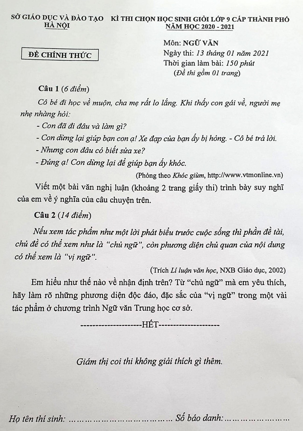 Mới đây, cộng đồng mạng tỏ ra vô cùng ngạc nhiên trước đề Văn kì thi học sinh giỏi lớp 9 cấp thành phố Hà Nội. Đề thi gồm 2 câu với tổng điểm là 20, trong đó nội dung câu đầu tiên mới là điều khiến nhiều người “choáng váng”. Khác với các câu chuyện có ý nghĩa hiển thị trên mặt chữ, câu 1 lại yêu cầu phân tích ý nghĩa câu chuyện ngắn với câu kết “Con dừng lại để giúp bạn ấy khóc”.