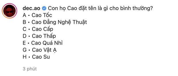 Trong bài đăng của mình, Decao đã vui mừng đăng 2 bức ảnh em bé kèm theo caption: Con họ Cao đặt tên là gì cho bình thường? Với tính tình "nhây" không ai lại của mình, Decao khoe con cũng phải chịu khó làm vài chiếc tên nghe vô cùng giải trí như: Cao Tốc, Cao Đẳng Nghệ Thuật, Cao Quá Nhỉ...