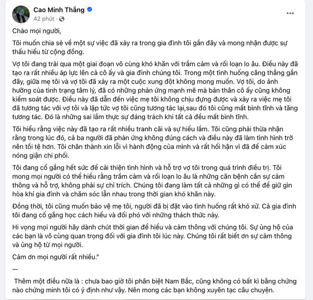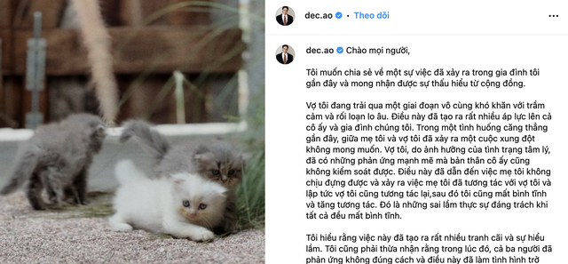 Trước đó, trong bài đăng của mình, Decao chia sẻ rằng, trong một tình huống căng thẳng, mẹ và vợ anh đã xảy ra những xung đột không mong muốn. Decao thừa nhận mọi người đều không bình tĩnh nên đã có những sai lầm thực sự đáng trách.