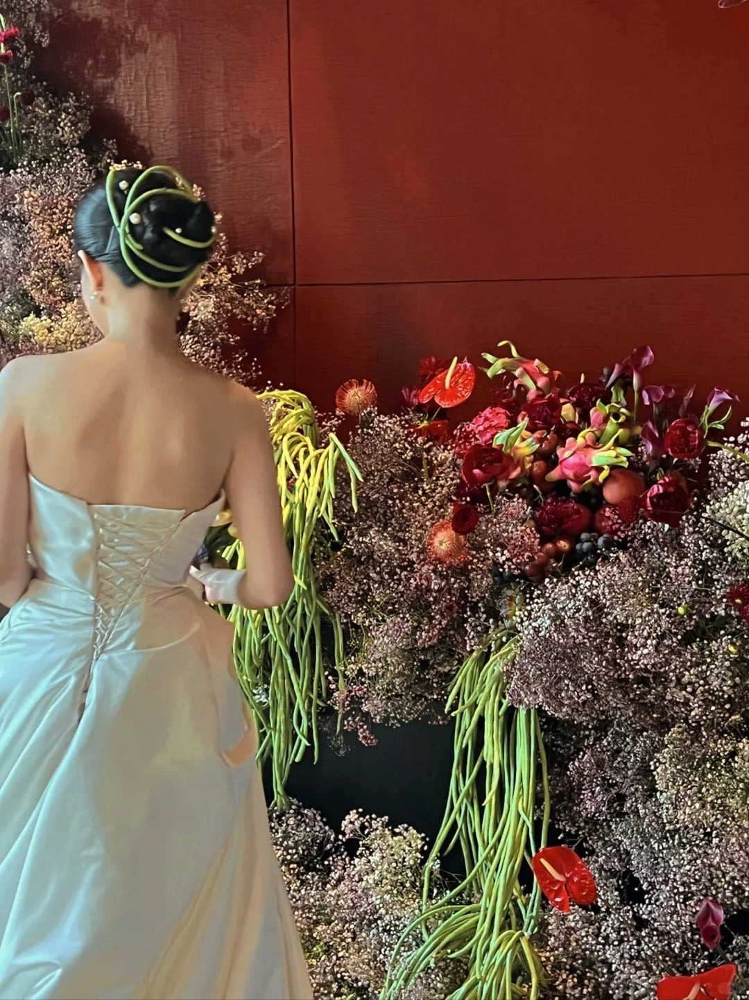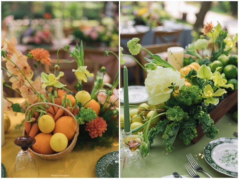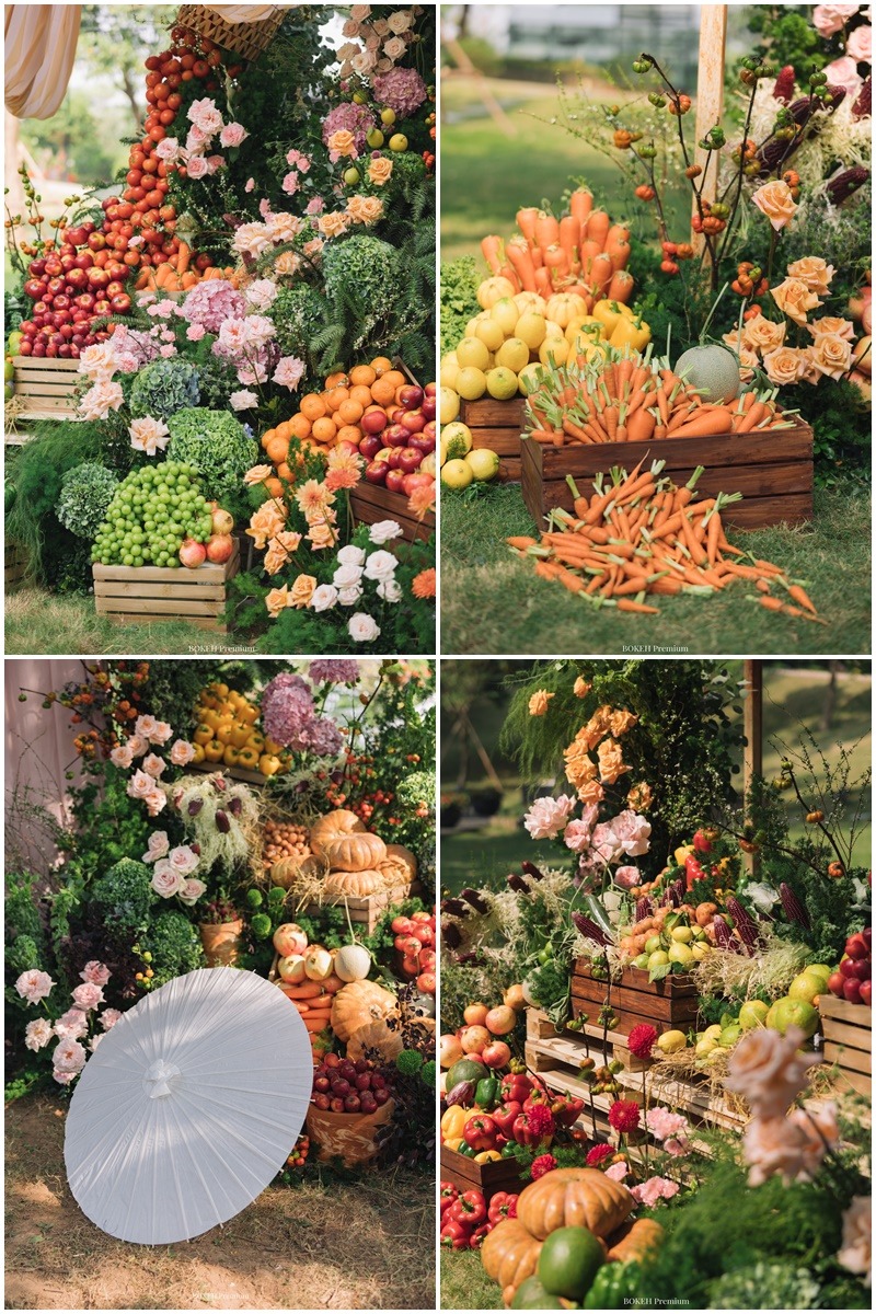 Trong không gian sân vườn ở nơi tổ chức đám cưới, đủ loại rau củ quả thường thấy ở chợ, siêu thị như táo, cà chua, cam, nho, cà rốt,... được bày biện và trang trí tạo nên một bữa tiệc rực rỡ sắc màu. Xen lẫn giữa hoa quả là nhiều loại hoa xinh xắn, giữ sự mềm mại cho đám cưới.