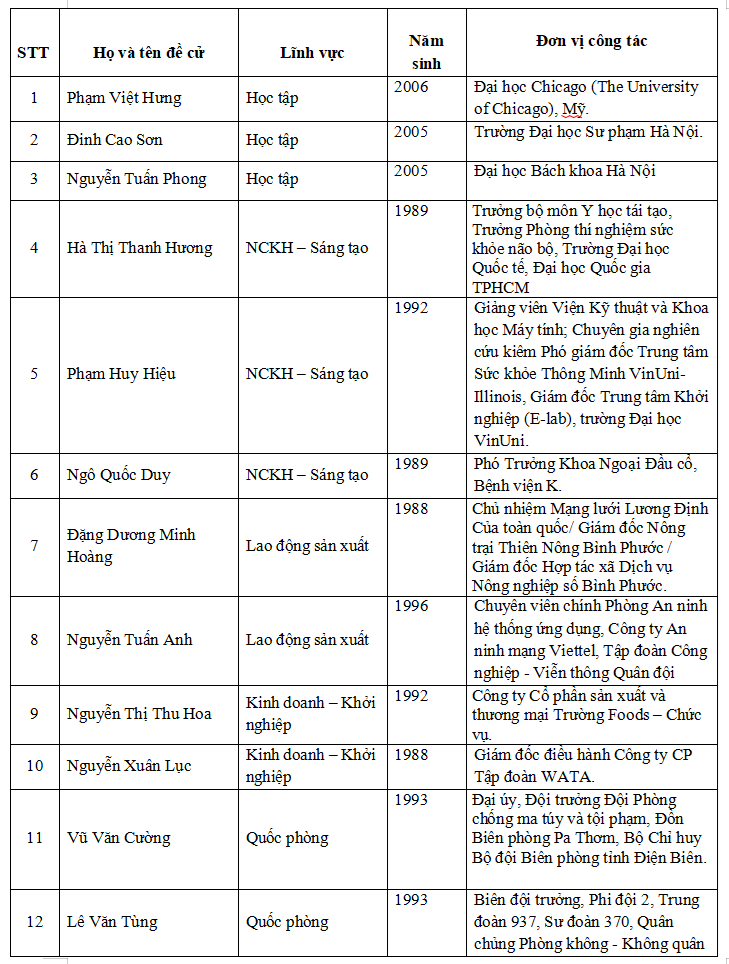171 đề cử thuộc 10 lĩnh vực: Học tập; Nghiên cứu Khoa học - Sáng tạo; Lao động sản xuất; Kinh doanh - Khởi nghiệp; Quốc phòng; An ninh trật tự; Thể dục Thể thao; Văn hóa nghệ thuật; Hoạt động xã hội; Quản lý Hành chính Nhà nước.