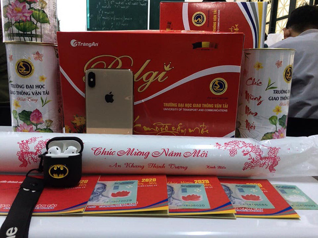 Bên dưới phần bình luận, cư dân mạng vô cùng thích thú, thậm chí khoe loạt ảnh những món quà Tết năm trước của các trường. Ngoài bánh kẹo, tấm lịch Tết và phong bao lì xì huyền thoại mỗi năm thì mới đây, sinh viên còn bắt trend cực mạnh bằng cách thêm vào hàng loạt siêu phẩm đón Tết như: Iphone 11, Iphone XS Max, tai nghe Bluetooth AirPods,... cùng muôn vàn những món quà "chịu chơi" khác nữa.