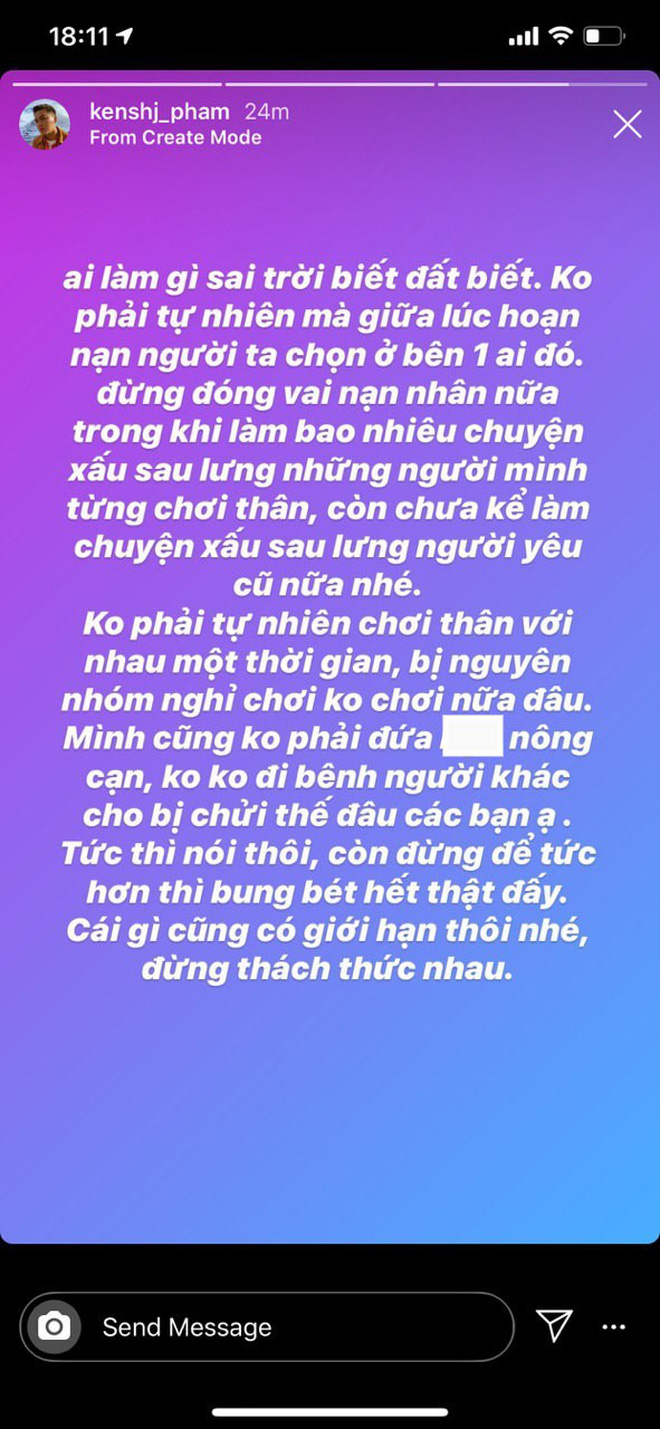 Anh chàng chia sẻ khá gay gắt: "Ai làm gì sai trời biết đất biết. Không phải tự nhiên mà giữa lúc hoạn nạn người ta chọn ở bên 1 ai đó. Đừng đóng vai nạn nhân nữa trong khi làm bao nhiêu chuyện xấu sau lưng những người mình từng chơi thân, còn chưa kể làm chuyện xấu sau lưng người yêu cũ nữa nhé. Không phải tự nhiên chơi thân với nhau một thời gian, bị nguyên nhóm nghỉ chơi không chơi nữa đâu." Trước đây, Kenshj từng có thời gian dài làm stylist cho Quỳnh Anh Shyn và mối quan hệ của họ cũng đã từng rất thân thiết.
