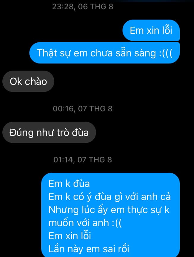 Về phần người bạn trai, có lẽ trong lúc hụt hẫng, ngỡ ngàng nên anh này đã có những tin nhắn khá hậm hực. Có thể hiểu cho tâm lý của chàng trai tội nghiệp trong câu chuyện. Anh đã cố giữ bình tĩnh nhưng có vẻ là không thể nguôi cơn ấm ức.