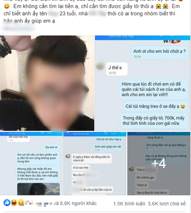 Gọi điện thì anh ấy bảo đấy coi như tiền xăng xe anh ấy đi lại. Em không cần tìm lại tiền ạ, chỉ cần tìm được giấy tờ thôi".